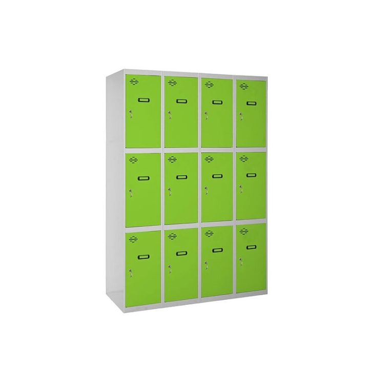 Casillero metálico de 4 cuerpos con 12 puertas de color gris y las puertas verdes. Las dimensiones son 1800x1200x500 mms.