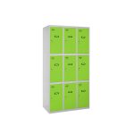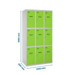 Casillero metálico de 3 cuerpos con 9 puertas de color gris y las puertas verdes. Las dimensiones son 1800x1200x500 mms.