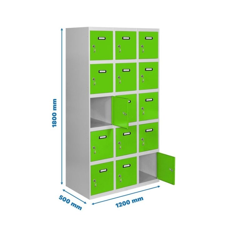 Casillero metálico de 3 cuerpos con 15 puertas de color gris y las puertas verdes. Las dimensiones son 1800x1200x500 mms.