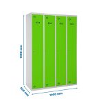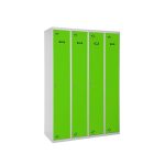 Taquilla metálica de 4 cuerpos con 4 puertas de color gris y las puertas verdes. Las dimensiones son 1800x1200x500 mms.