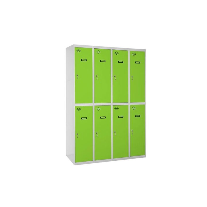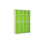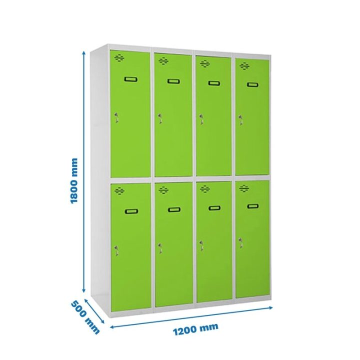 Taquilla metálica de 4 cuerpos con 8 puertas de color gris y las puertas verdes. Las dimensiones son 1800x1200x500 mms.