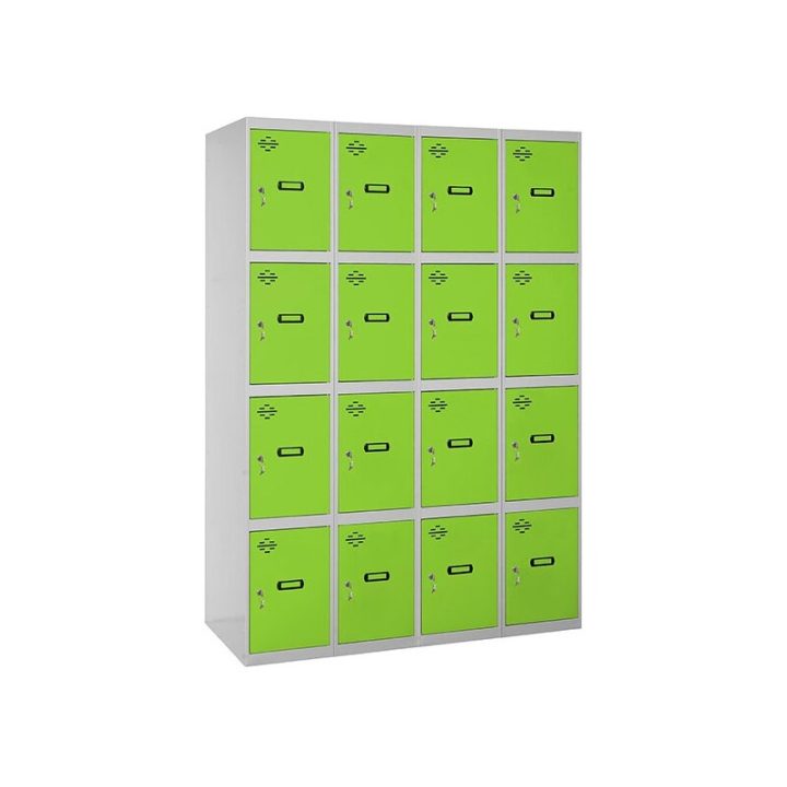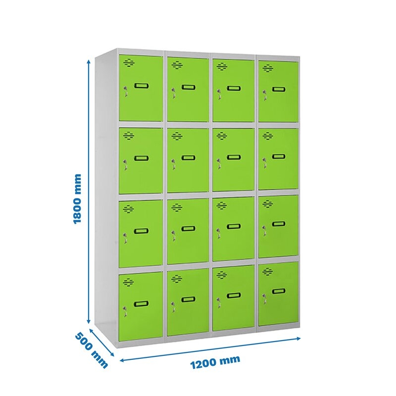 Casillero metálico de 4 cuerpos con 16 puertas de color gris y las puertas verdes. Las dimensiones son 1800x1200x500 mms.