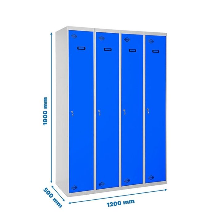 Taquilla metálica de 4 cuerpos con 4 puertas de color gris y las puertas azules. Las dimensiones son 1800x1200x500 mms.