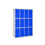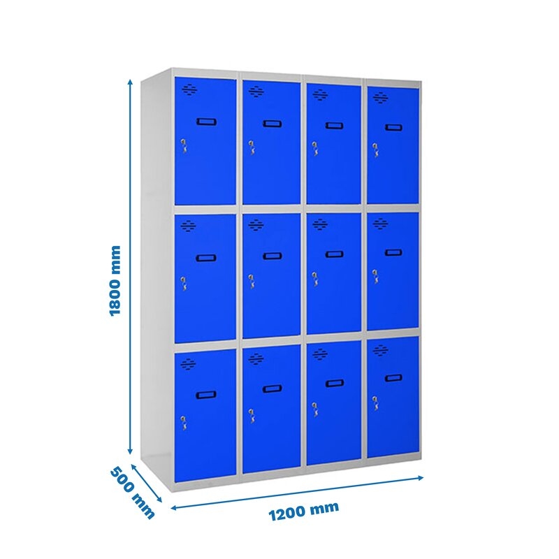 Casillero metálico de 4 cuerpos con 12 puertas de color gris y las puertas azules. Las dimensiones son 1800x1200x500 mms.