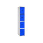 Casillero metálico de 1 cuerpo con 4 puertas de color gris y las puertas azules. Las dimensiones son 1800x300x500 mms.