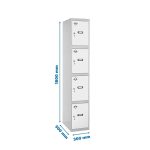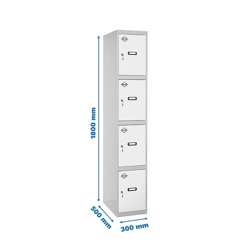 Casillero metálico de 1 cuerpo con 4 puertas de color gris y las puertas blancas. Las dimensiones son 1800x300x500 mms.