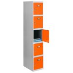 Casillero metálico de 1 cuerpo con 5 puertas de color gris y las puertas naranjas. Las dimensiones son 1800x300x500 mms.