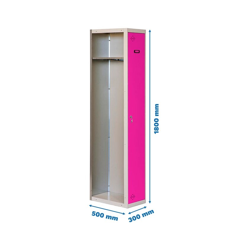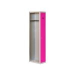 Taquilla metálica de 1 cuerpo con 1 puertas de color gris y las puertas rosas. Las dimensiones son 1800x300x500 mms.