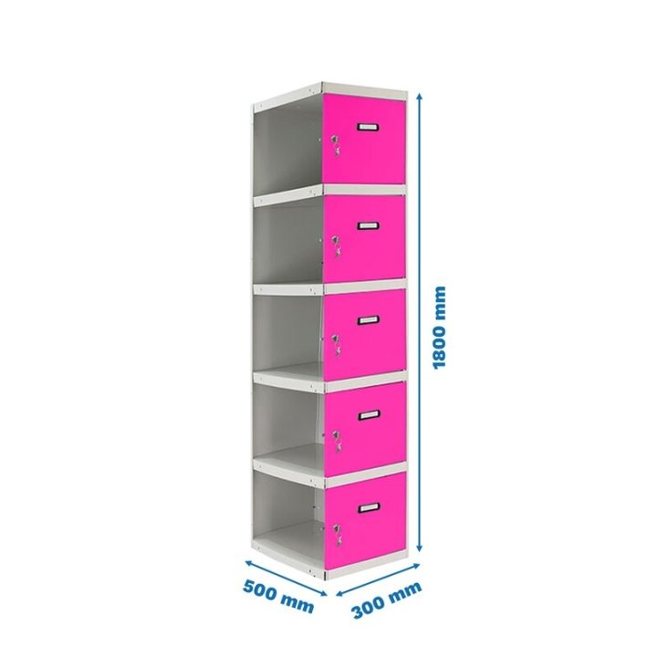 Casillero metálico de 1 cuerpo con 5 puertas de color gris y las puertas rosas. Las dimensiones son 1800x300x500 mms.