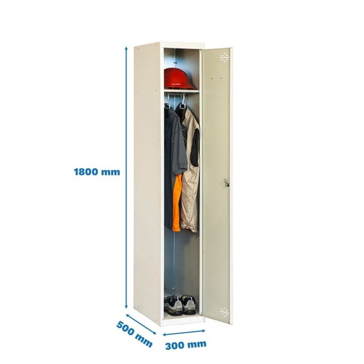 Taquilla metálica de 1 cuerpo con 1 puertas de color gris. Las dimensiones son 1800x300x500 mms. Se entrega desmontado e incluye un estante, perchero, una cerradura, respiradero y etiquetero para mayor comodidad del usuario. Se monta de forma fácil siguiendo las instrucciones o viendo el vídeo de montaje en Youtube.