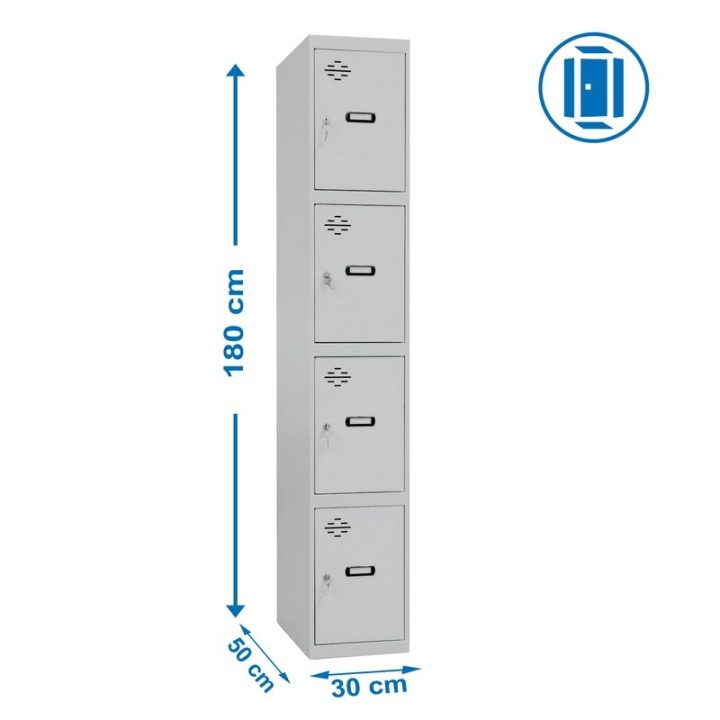 Casillero metálico de 1 cuerpo con 4 puertas de color gris. Las dimensiones son 1800x300x500 mms. Se entrega desmontado e incluye un estante, perchero, una cerradura, respiradero y etiquetero para mayor comodidad del usuario. Se monta de forma fácil siguiendo las instrucciones o viendo el vídeo de montaje en Youtube.