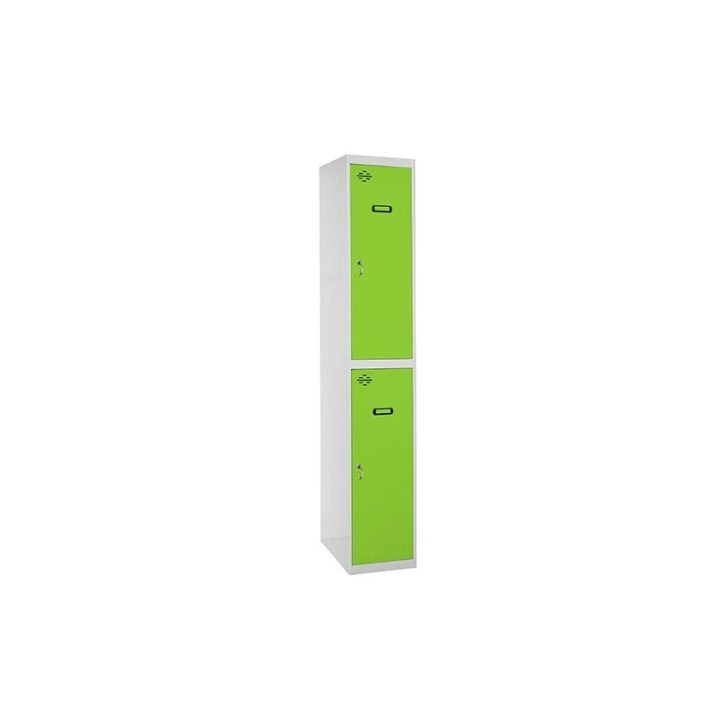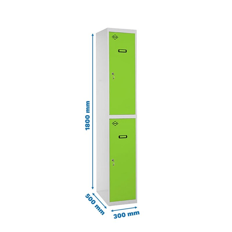 Taquilla metálica de 1 cuerpo con 2 puertas de color gris y las puertas verdes. Las dimensiones son 1800x300x500 mms.