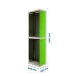 Taquilla metálica de 1 cuerpo con 2 puertas de color gris y las puertas verdes. Las dimensiones son 1800x300x500 mms.