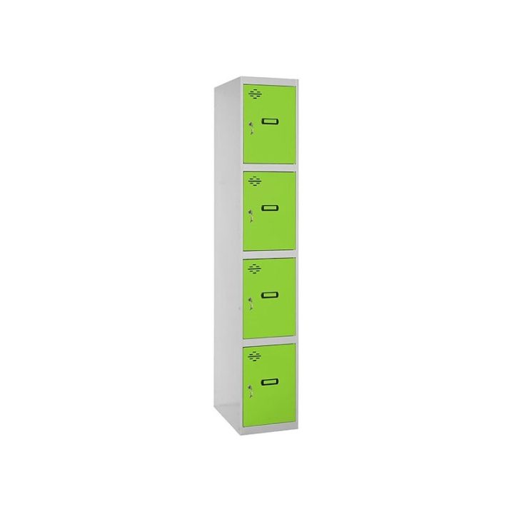 Casillero metálico de 1 cuerpo con 4 puertas de color gris y las puertas verdes. Las dimensiones son 1800x300x500 mms.