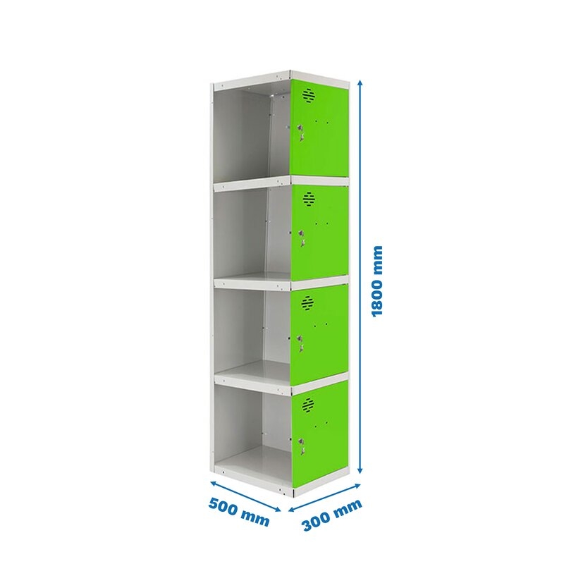 Casillero metálico de 1 cuerpo con 4 puertas de color gris y las puertas verdes. Las dimensiones son 1800x300x500 mms.