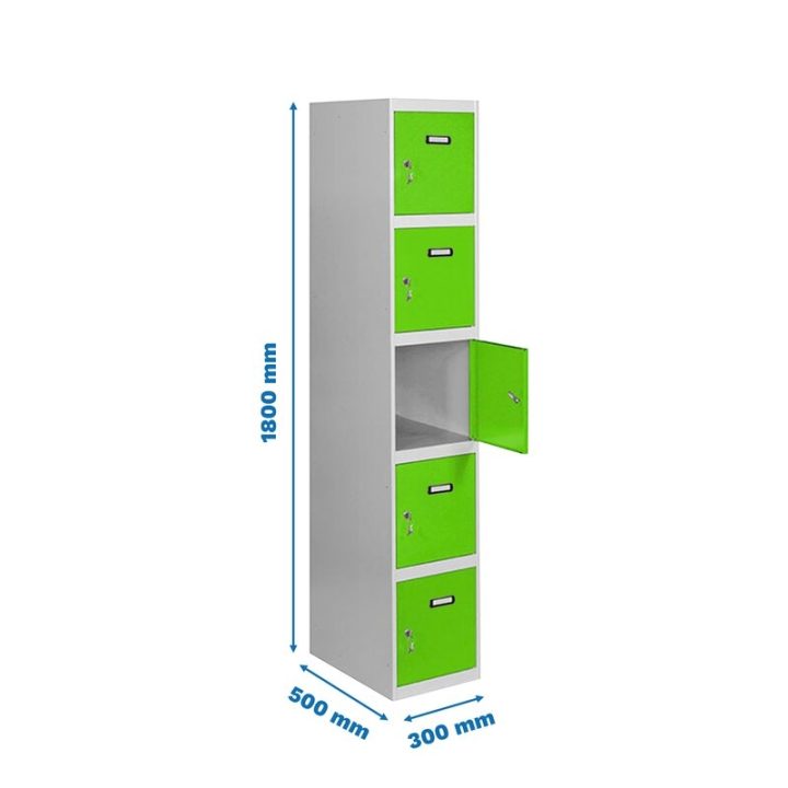 Casillero metálico de 1 cuerpo con 5 puertas de color gris y las puertas verdes. Las dimensiones son 1800x300x500 mms.