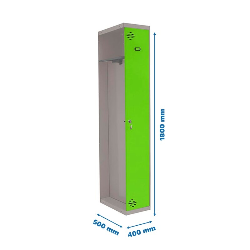 Taquilla metálica de 1 cuerpo con 1 puertas de color gris y las puertas verdes. Las dimensiones son 1800x300x500 mms.