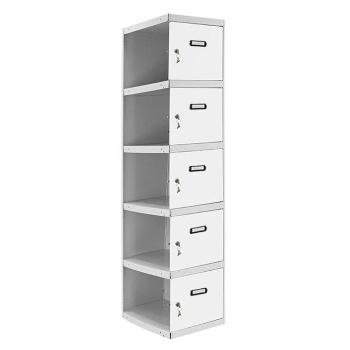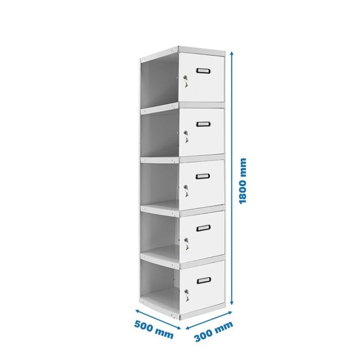 Casillero metálico de 1 cuerpo con 5 puertas de color gris y las puertas blancas. Las dimensiones son 1800x300x500 mms.
