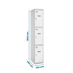 Casillero metálico de 1 cuerpo con 3 puertas de color gris y las puertas blancas. Las dimensiones son 1800x300x500 mms.