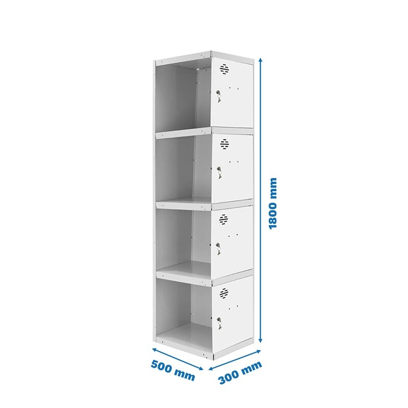 Casillero metálico de 1 cuerpo con 4 puertas de color gris y las puertas blancas. Las dimensiones son 1800x300x500 mms.