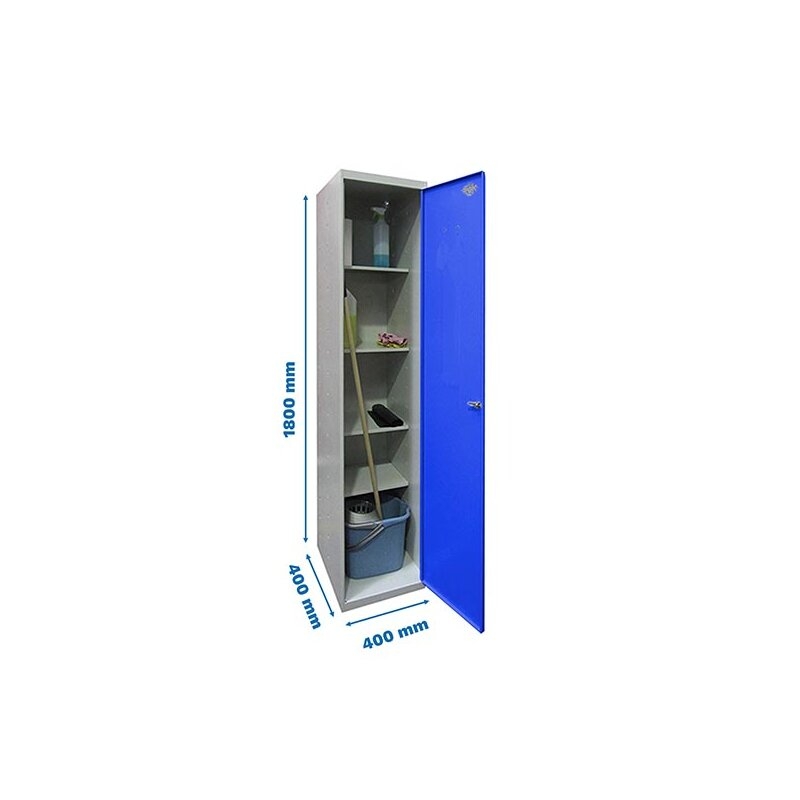 Armario metálico en gris y las puertas azules de 1 puerta y 4 estantes.