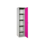 Armario metálico en gris y las puertas rosas de 1 puerta y 4 estantes.