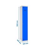 Taquilla metálica de 1 cuerpo con 1 puerta de color gris y las puertas azules. Las dimensiones son 1800x400x500 mms.