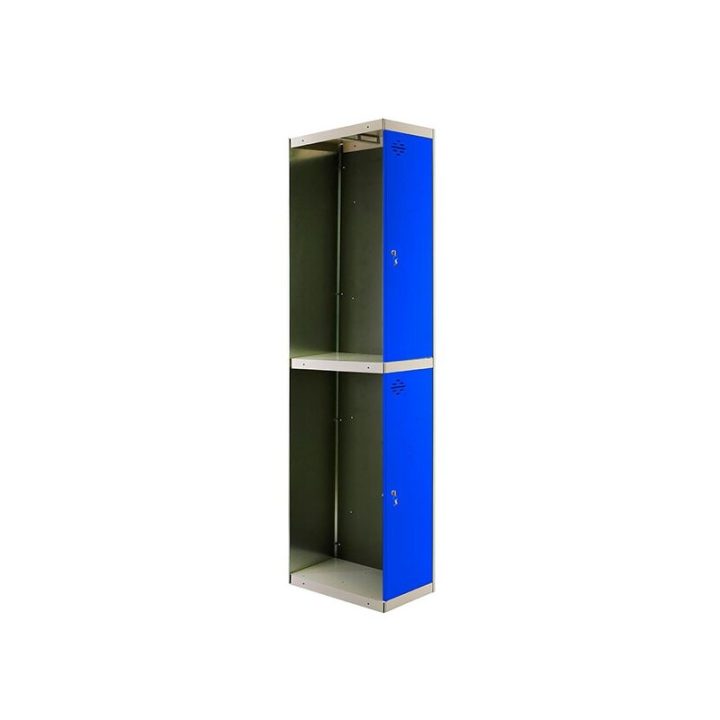 Taquilla metálica de 1 cuerpo con 2 puertas de color gris y las puertas azules. Las dimensiones son 1800x400x500 mms.