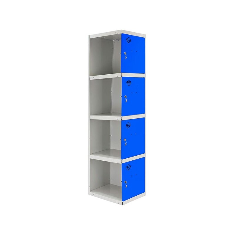 Casillero metálico de 1 cuerpo con 4 puertas de color gris y las puertas azules. Las dimensiones son 1800x400x500 mms.