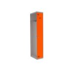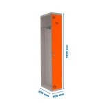 Taquilla metálica de 1 cuerpo con 1 puerta de color gris y las puertas naranjas. Las dimensiones son 1800x400x500 mms.