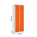 Taquilla metálica de 2 cuerpos con 2 puertas de color gris y las puertas naranjas. Las dimensiones son 1800x400x500 mms.