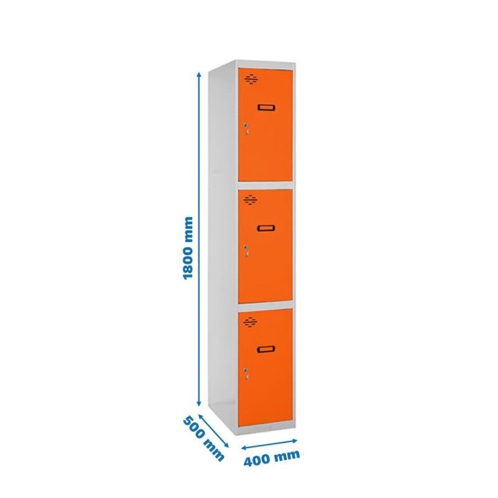 Casillero metálico de 1 cuerpo con 3 puertas de color gris y las puertas naranjas. Las dimensiones son 1800x400x500 mms.