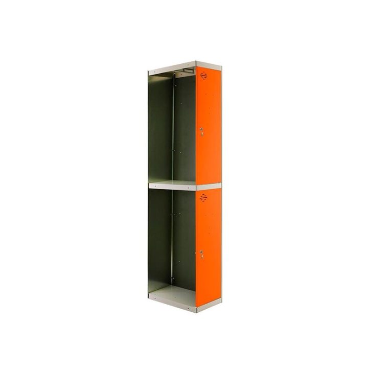 Taquilla metálica de 1 cuerpo con 2 puertas de color gris y las puertas naranjas. Las dimensiones son 1800x400x500 mms.