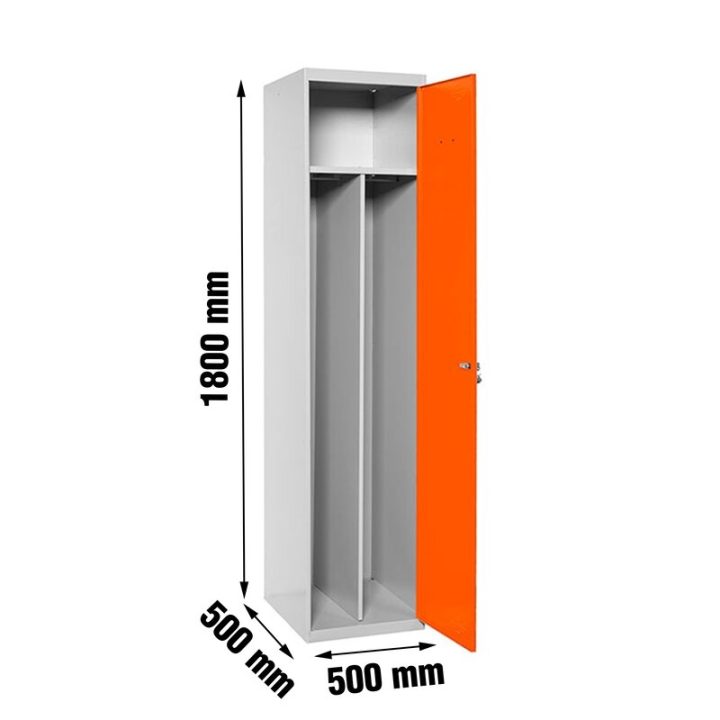 Taquilla metálica de 1 cuerpo con 1 puerta de color gris y las puertas naranjas. Las dimensiones son 1800x400x500 mms.
