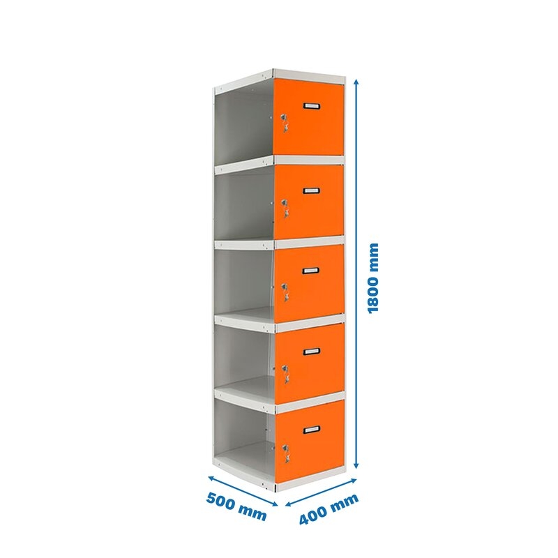 Casillero metálico de 1 cuerpo con 5 puertas de color gris y las puertas naranjas. Las dimensiones son 1800x400x500 mms.