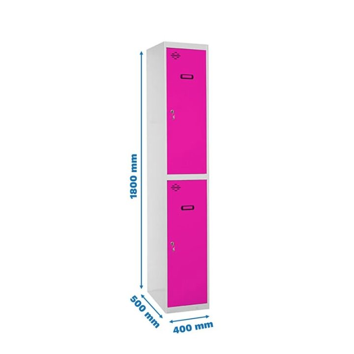 Taquilla metálica de 1 cuerpo con 2 puertas de color gris y las puertas rosas. Las dimensiones son 1800x400x500 mms.