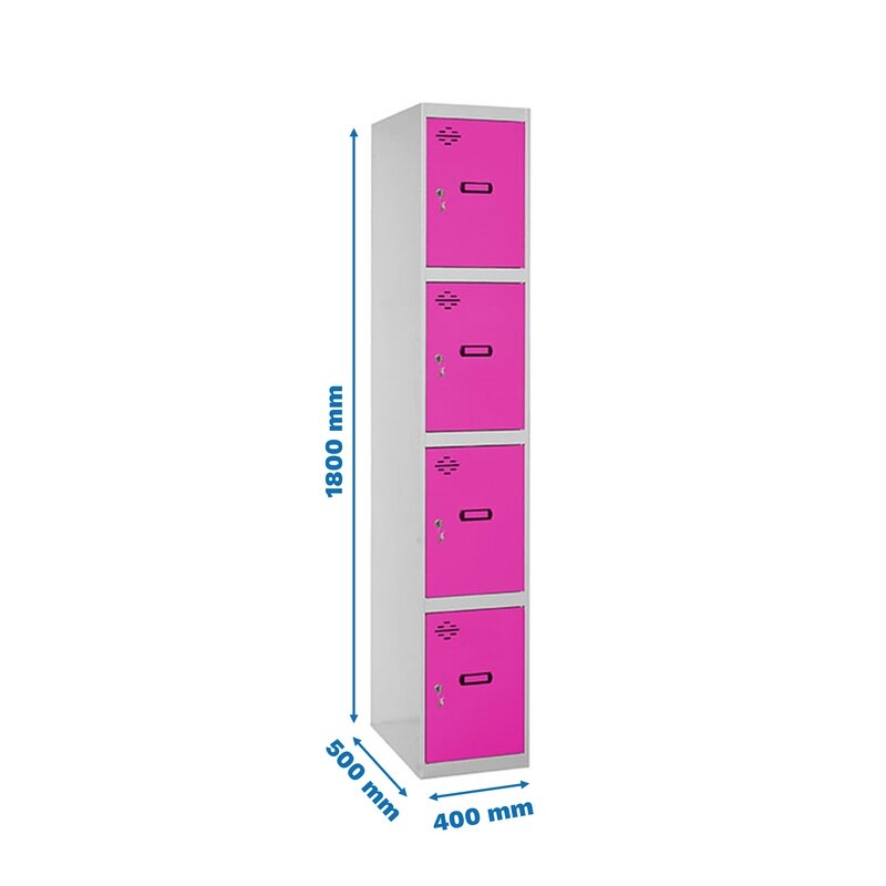 Casillero metálico de 1 cuerpo con 4 puertas de color gris y las puertas rosas. Las dimensiones son 1800x400x500 mms.