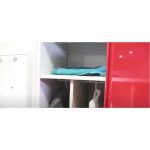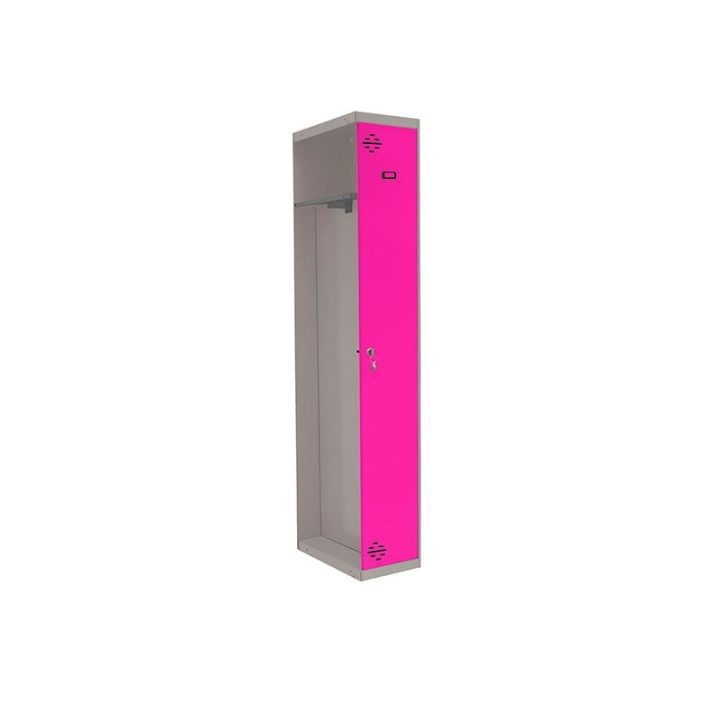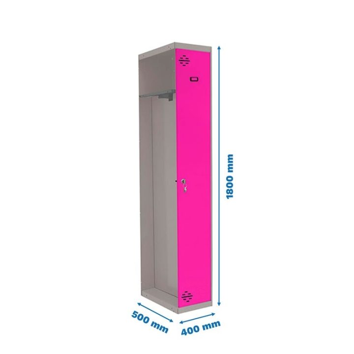 Taquilla metálica de 1 cuerpo con 1 puertas de color gris y las puertas rosas. Las dimensiones son 1800x400x500 mms.