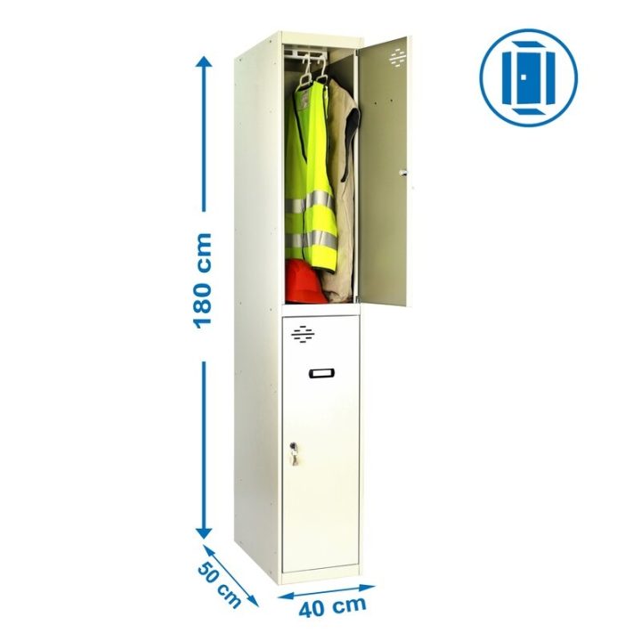 Taquilla metálica de 1 cuerpo con 2 puertas de color gris. Las dimensiones son 1800x400x500 mms. Se entrega desmontado e incluye un estante, perchero, una cerradura, respiradero y etiquetero para mayor comodidad del usuario. Se monta de forma fácil siguiendo las instrucciones o viendo el vídeo de montaje en Youtube.