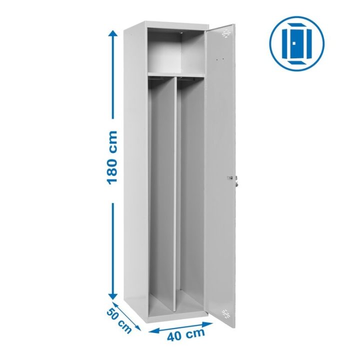 Taquilla metálica de 1 cuerpo con 2 puertas de color gris. Las dimensiones son 1800x400x500 mms. Se entrega desmontado e incluye un estante, perchero, una cerradura, respiradero y etiquetero para mayor comodidad del usuario. Se monta de forma fácil siguiendo las instrucciones o viendo el vídeo de montaje en Youtube.Incluye un separador o divisor interno que sirve para separar el espacio interior.