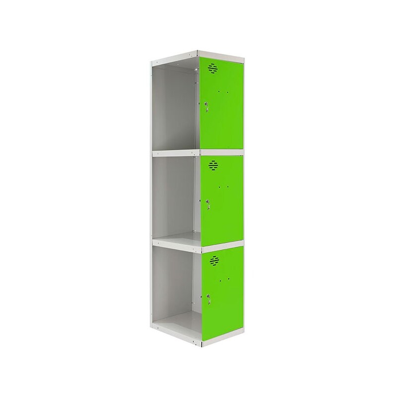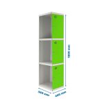 Casillero metálico de 1 cuerpo con 3 puertas de color gris y las puertas verdes. Las dimensiones son 1800x400x500 mms.