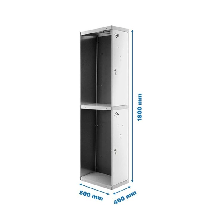 Taquilla metálica de 1 cuerpo con 2 puertas de color gris y las puertas blancas. Las dimensiones son 1800x400x500 mms.
