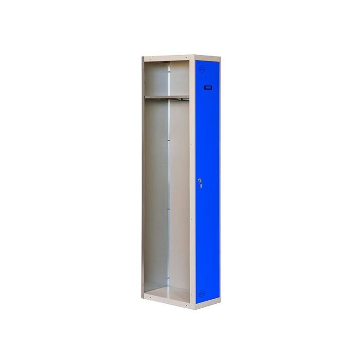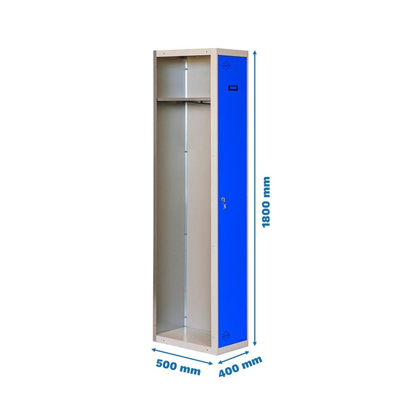 Taquilla metálica de 1 cuerpo con 1 puerta de color gris y las puertas azules. Las dimensiones son 1800x500x500 mms.