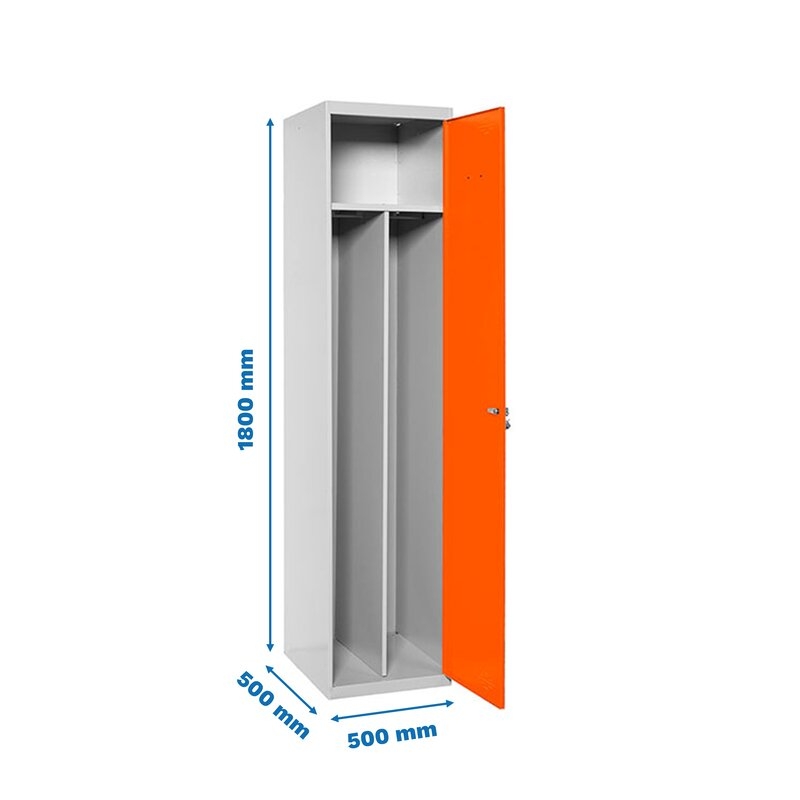 Taquilla metálica de 1 cuerpo con 1 puertas de color gris y las puertas naranjas. Las dimensiones son 1800x500x500 mms.