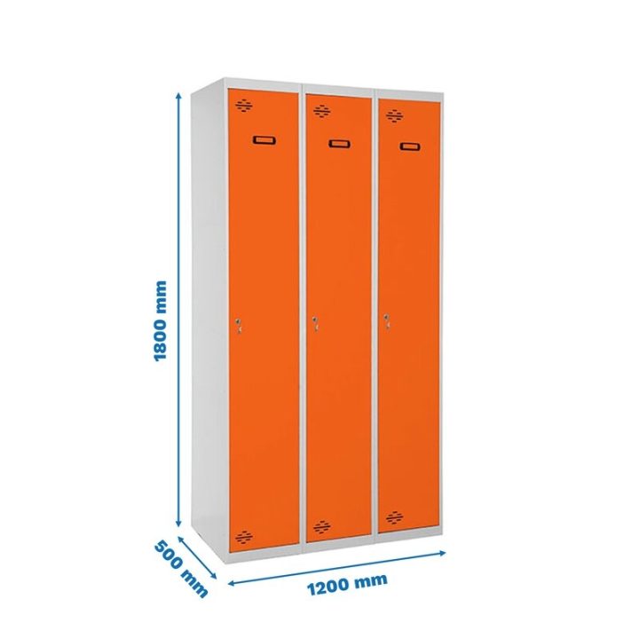 Taquilla metálica de 3 cuerpos con 3 puertas de color gris y las puertas naranjas. Las dimensiones son 1800x500x500 mms.