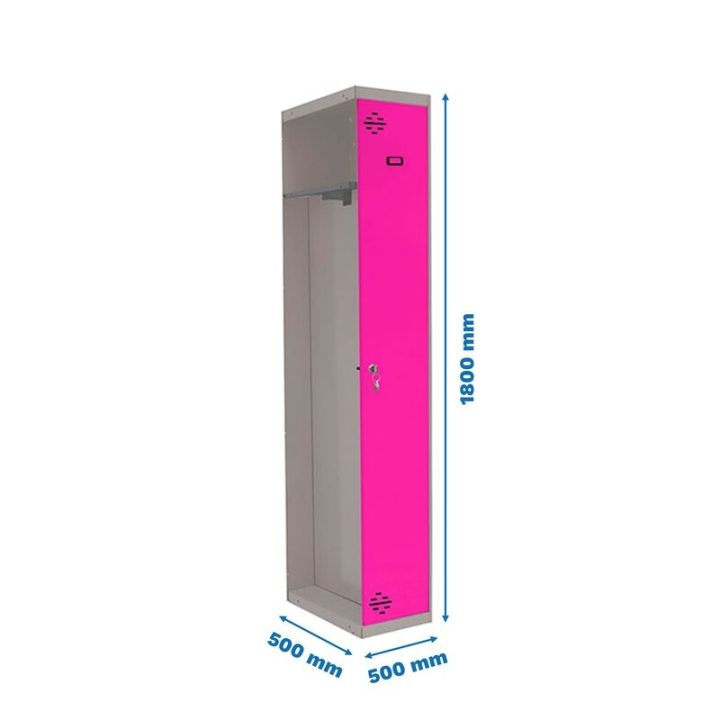 Taquilla metálica de 1 cuerpo con 1 puertas de color gris y las puertas rosas. Las dimensiones son 1800x500x500 mms.