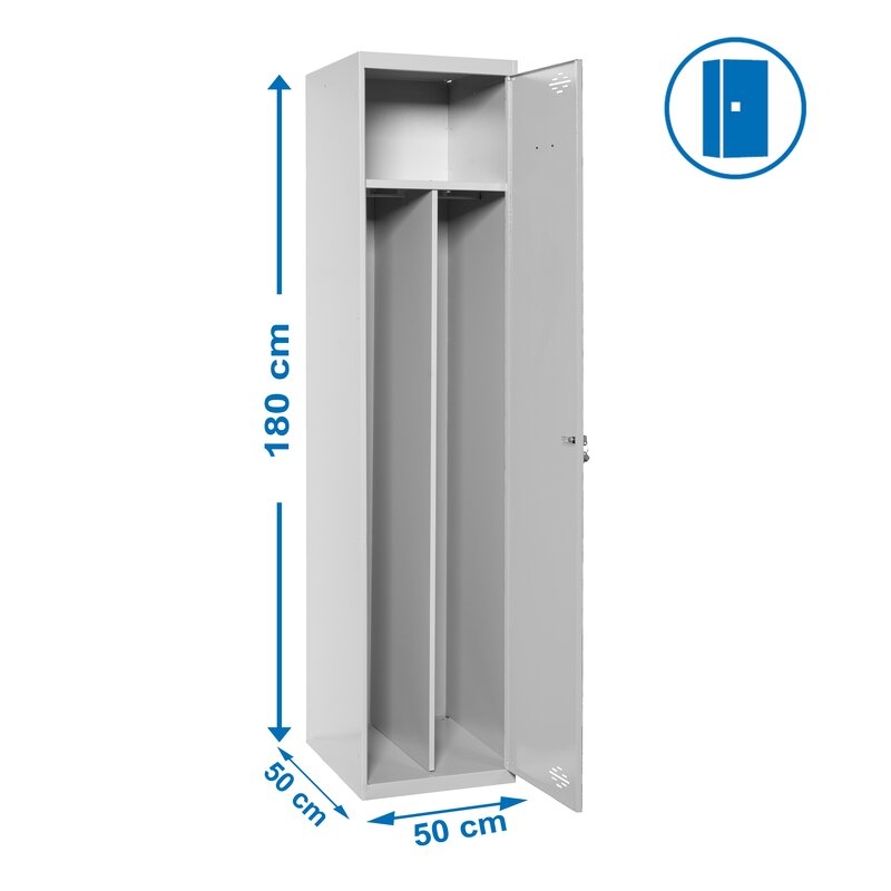Taquilla metálica de 2 cuerpos con 2 puertas de color gris. Las dimensiones son 1800x500x500 mms. Se entrega montado e incluye un divisor que divide en dos el espacio interior, un estante, perchero, una cerradura, respiradero y etiquetero para mayor comodidad del usuario.
