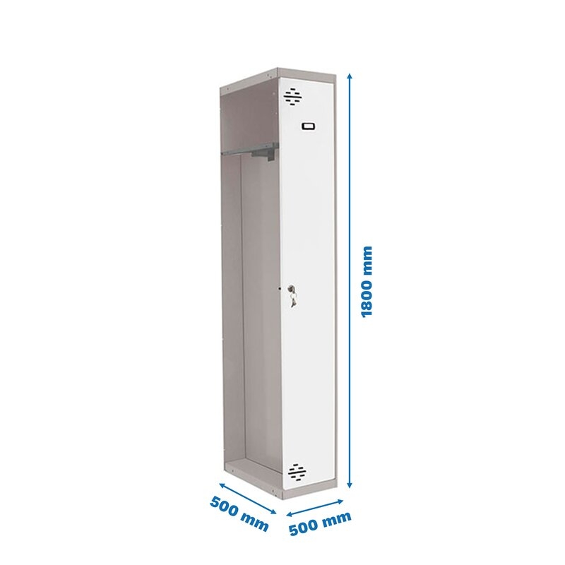 Taquilla metálica de 1 cuerpo con 1 puertas de color gris y las puertas blancas. Las dimensiones son 1800x500x500 mms.