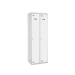 Taquilla metálica de 2 cuerpos con 2 puertas de color gris y las puertas blancas. Las dimensiones son 1800x600x500 mms.