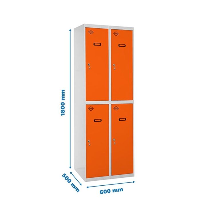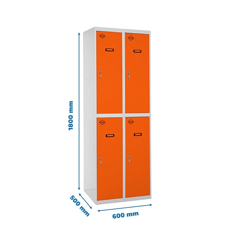 Taquilla metálica de 2 cuerpos con 4 puertas de color gris y las puertas naranjas. Las dimensiones son 1800x600x500 mms.